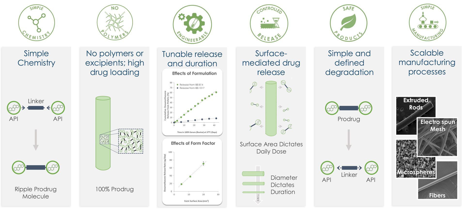 At Ripple, we discovered that with a small amount of chemical engineering, drugs can be transformed into implantable prodrug materials.